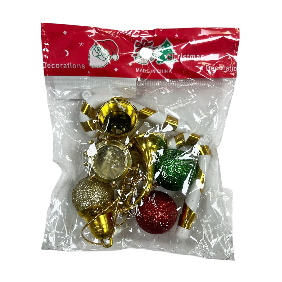 Adorno Navidad Set Modelos Surtidos x9u Incluye: 3 bola borlas , 2 bastones ,2 campanas ,1 tambor , 1 trompeta Medida Aproximada : 3cm