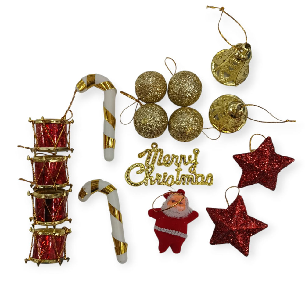 Adorno Navideño Surtido 3 cm 16 Pcs Dorado Rojo en Caja de Acetato Incluye: 4 Tambores, 2 Bastones de Caramelo, 4 Bolas Doradas, 2 Campanas, 2 Estrellas Rojas, 1 Papa Noel y 1 Merry Christmas Medida Aproximada : 3 cm