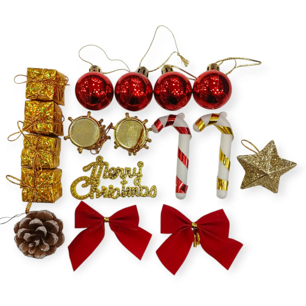 Adorno Navideño Surtido 3 cm 17 Pcs Dorado Rojo en Caja de Acetato Incluye: 4 Regalos Dorados, 4 Bolas Rojas, 2 Tambores, 2 Bastones de Caramelo, 2 Moños Rojos, 1 Piña, 1 Merry Christmas y 1 Estrella Dorada Medida Aproximada : 3 cm