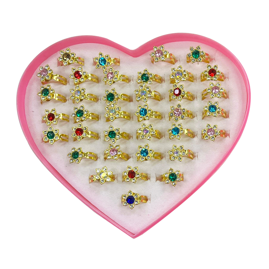 Anillo de Metal Dorado con Aplique Forma de Flor Cristales Colores y Modelos Surtido x1 Unidad Medidas aproximadas: 1,5 cm de Diametro para el dedo – Flexible, puede abrirse para ampliar Los motivos se entregan surtidos según disponibilidad del stock