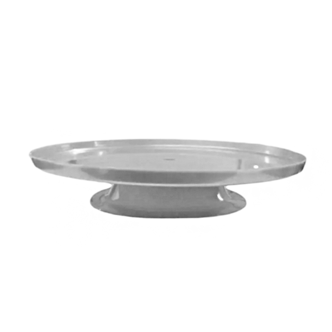 Bandeja Posa Torta con Pie Color Plata / Plateada Material: Plastico Alto: 5cm Circunferencia de la bandeja: 26cm