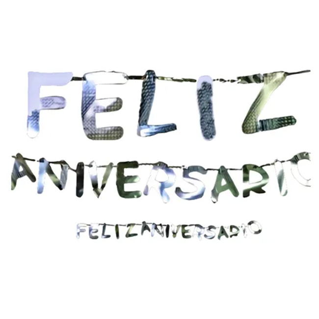 Banderin Palabra Gigante Cartel FELIZ ANIVERSARIO Letras Plateadas Holográficas