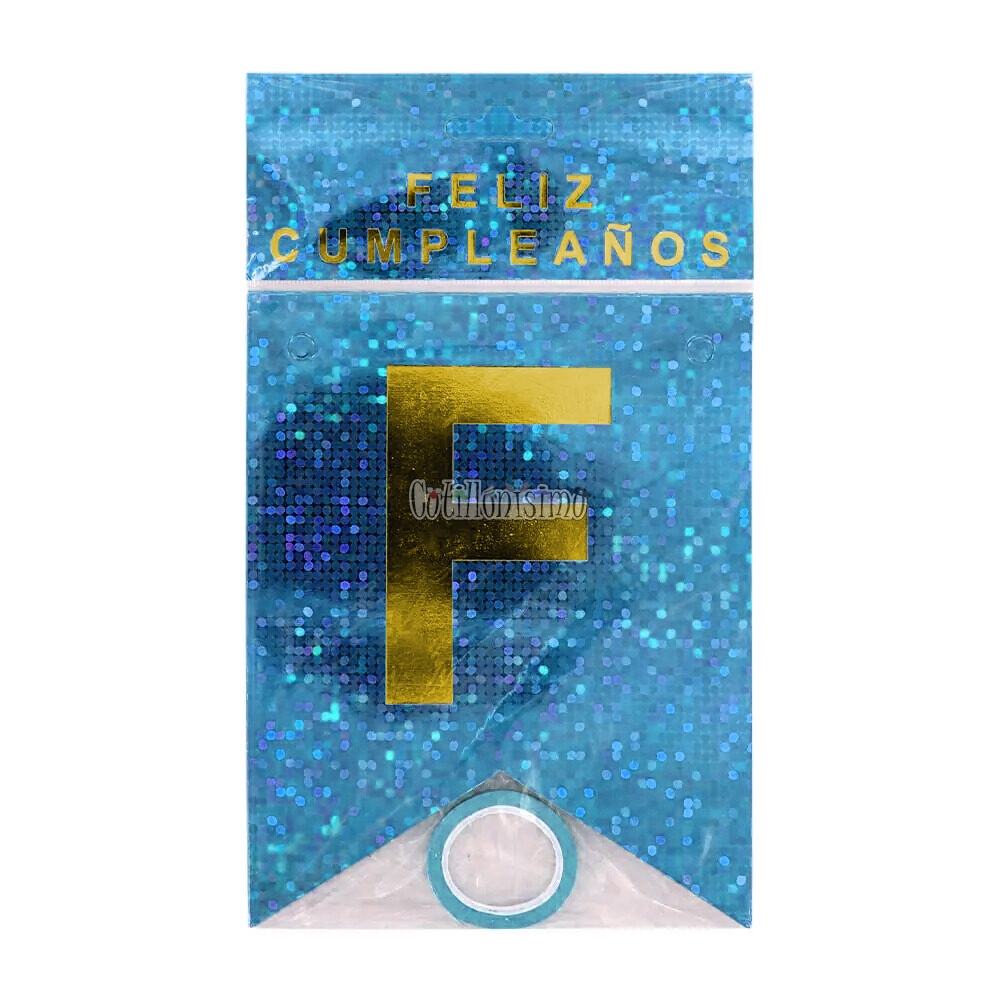 Banderin «FELIZ CUMPLEAÑOS» Holografico Celeste Letras Doradas Modelo Medieval