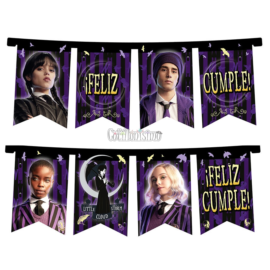 Banderín Merlina Adams 3mts – Licencia Oficial C.O Banderín de Feliz Cumpleaños con Imagenes surtidas de los personajes de Merlina Tamaño aproximado: 3 Mts de largo total – 18cm de alto x 11cm de ancho Material: Cartón Los Banderines vienen unidos entre si ya listos para colgar