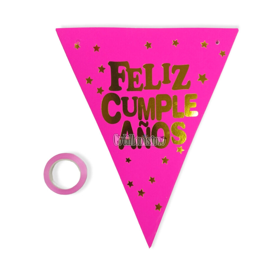 Banderin Triangular «FELIZ CUMPLEAÑOS» Rosa / Fucsia Fluo con Detalles y Letras Doradas Medida: 17 x 20cm Incluye cinta para colgar