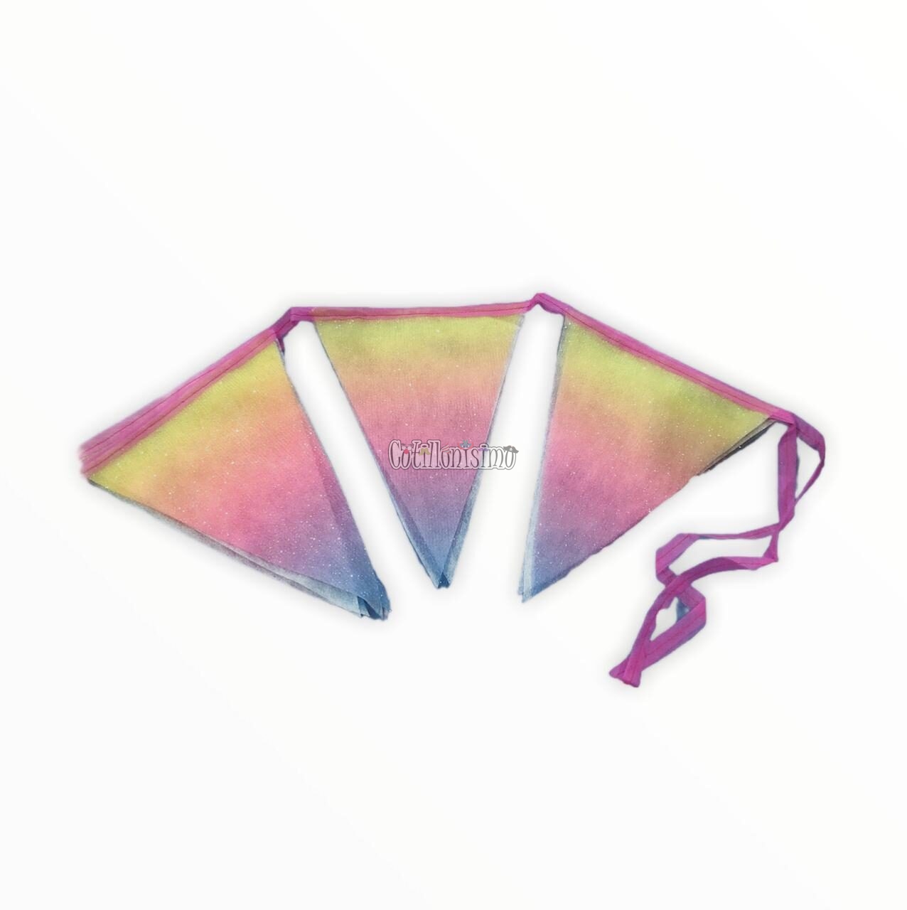 Banderin TULL con Brillo Arcoiris Contiene: 8 Triangulos en colores Arcoiris 2,5 Metros de Piola cocida para colgar.