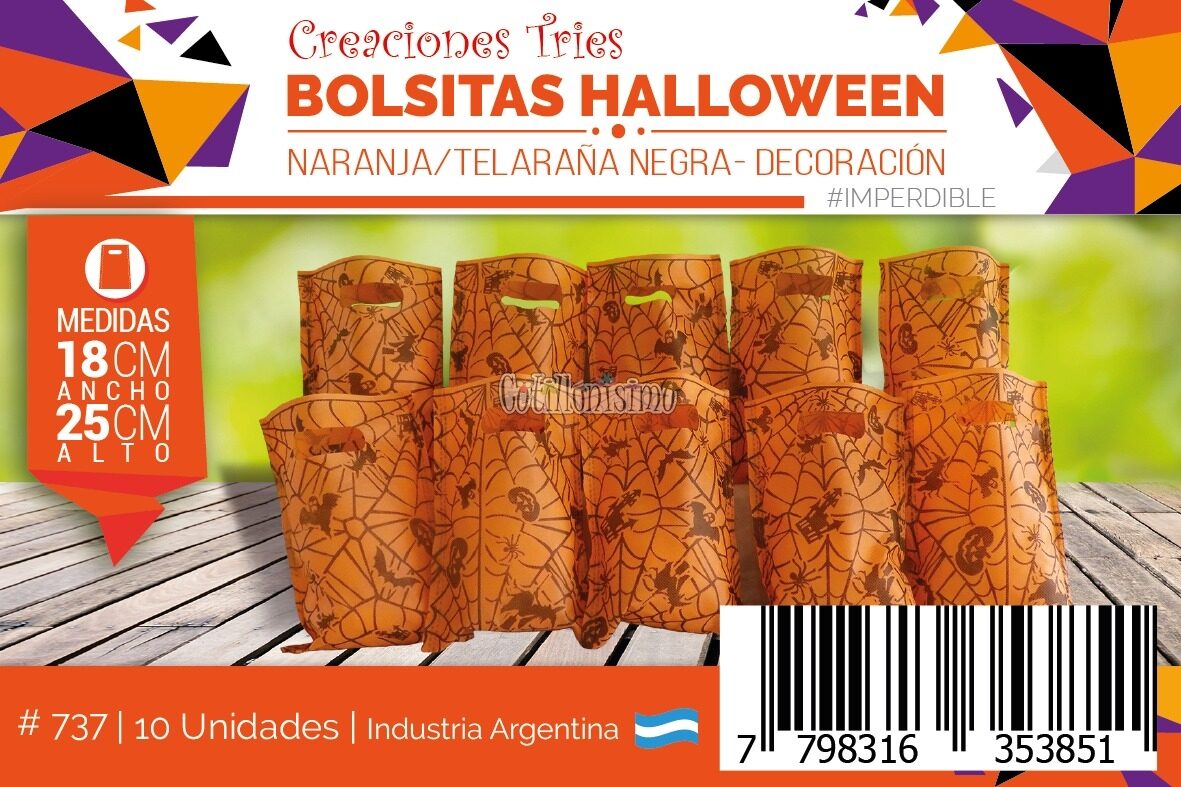 Bolsa Tela Araña Halloween Golosinera Cotillon Telaraña Negra Base Naranja (Friselina) X10 Unidades