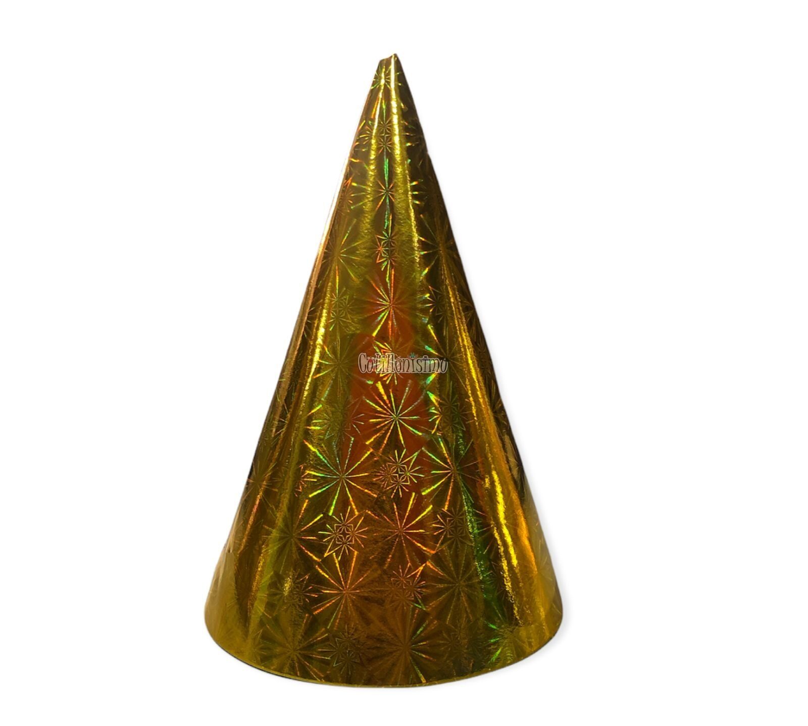 Bonete Cumpleaños Cartón Holográfico Dorado Medidas aproximadas: 13cm de circunferencia y 19cm de alto.