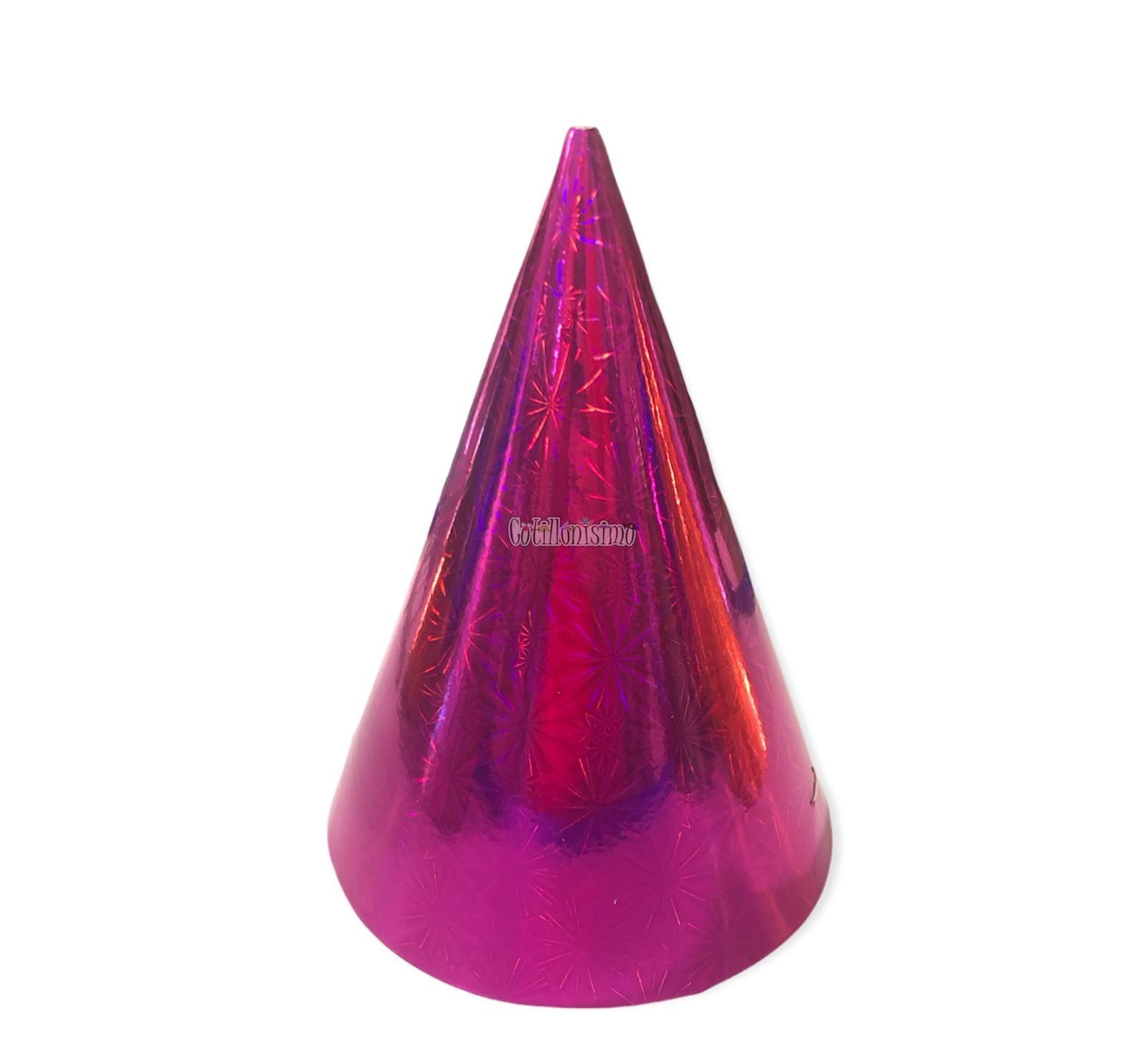 Bonete Cumpleaños Cartón Holográfico Fucsia/Rosa Medidas aproximadas: 13cm de circunferencia y 19cm de alto.