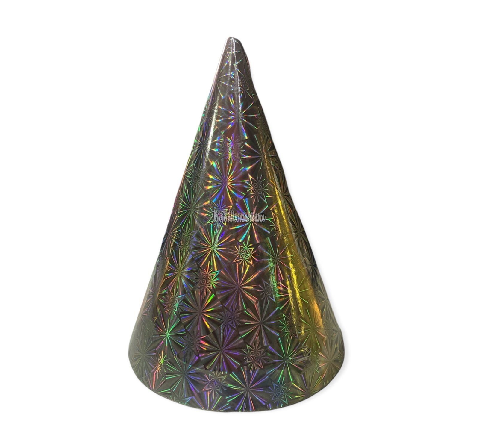 Bonete Cumpleaños Cartón Holográfico Plateado Medidas aproximadas: 13cm de circunferencia y 19cm de alto.