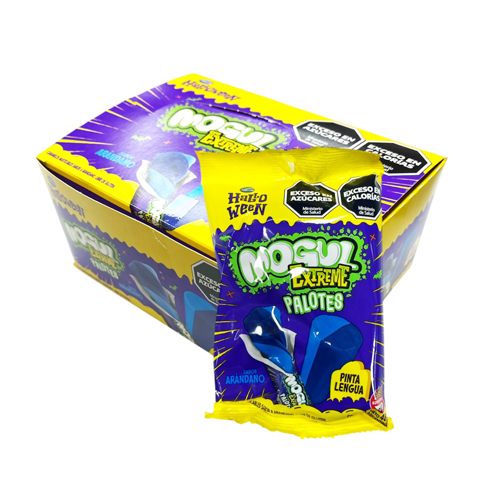 Caja de Caramelos Halloween Masticable Mogul Extreme Palotes Acidos Arándano Pinta Lengua Contiene 8 paquetes de x48gr c/u – x384gr Sabor Arandano