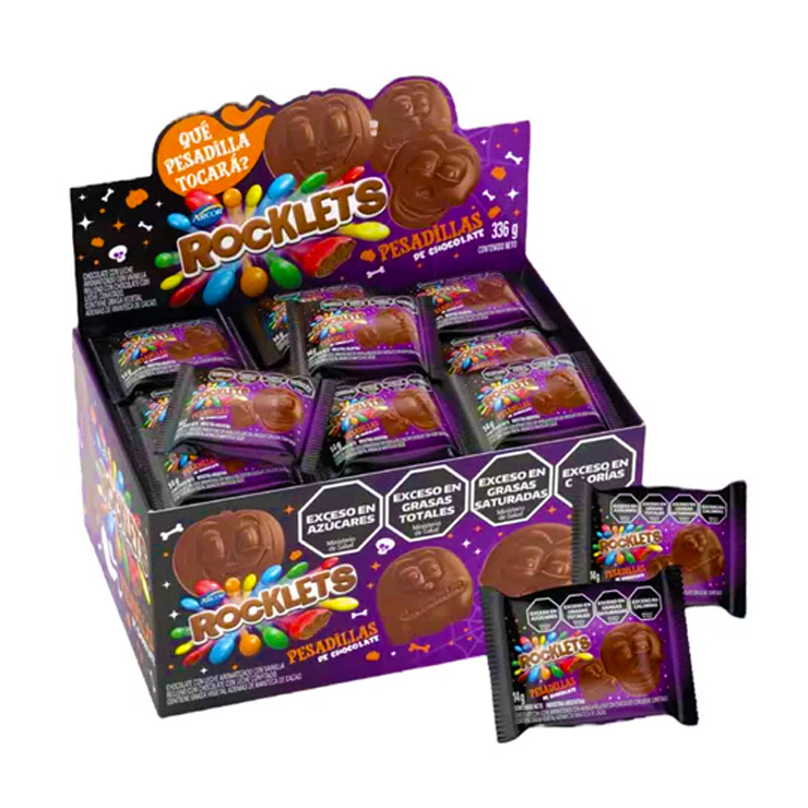 Caja Bombon Bocadito Rocklets Pesadillas de Chocolate Halloween x14g c/u 24 Unidades Peso total 336gr