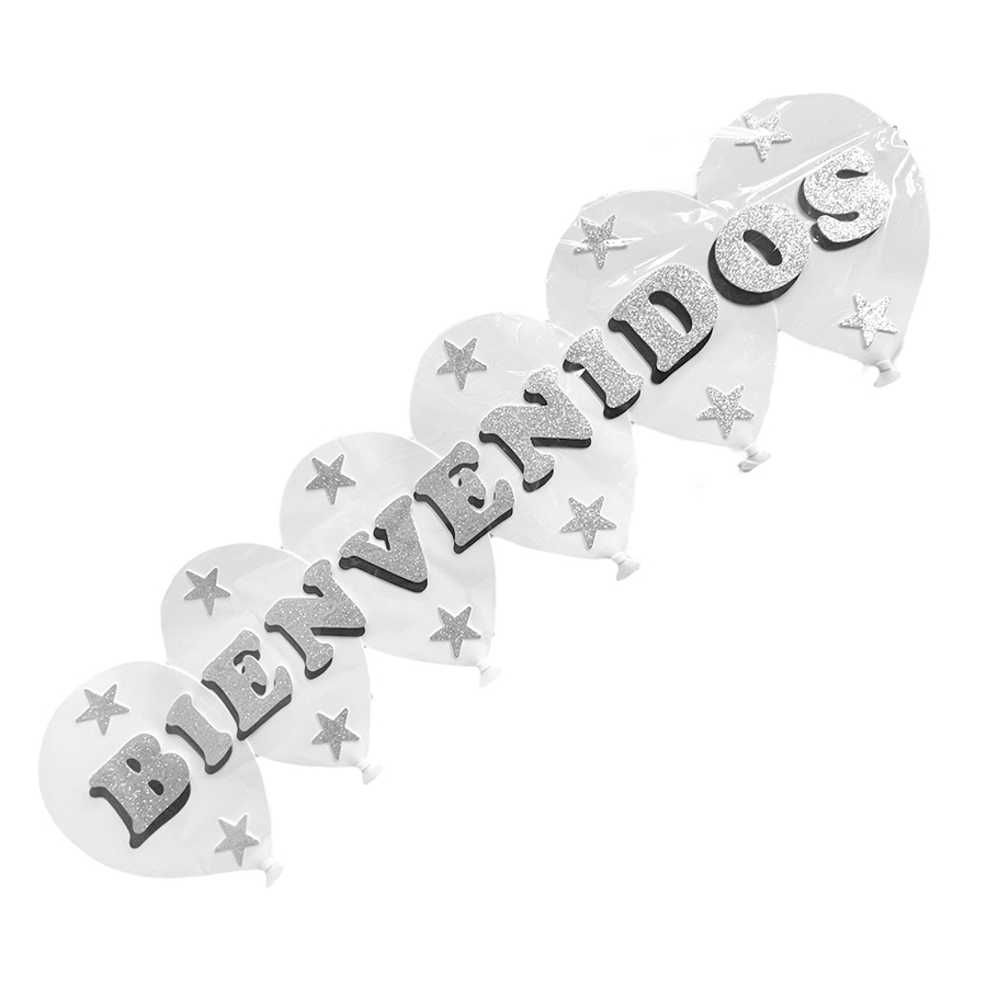 Cartel Estilo Globo Bienvenidos Blanco y Plateado Goma Eva