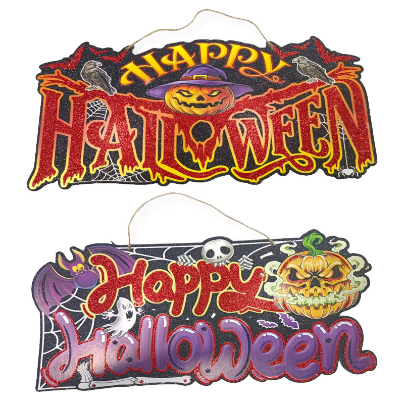 Cartel Adorno Aplique Puerta Happy Halloween con Brillo / Glitter / Gibré Modelos Surtidos Medida total: 40 cm x 18 cm aproximadamente