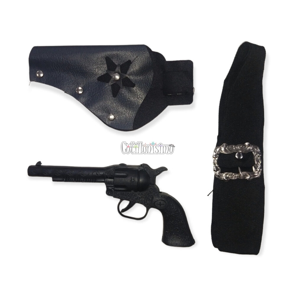 Cartuchera – Estuche Sheriff / Cowboy / Vaquero con Cinturón y Revolver / Pistola Simple (Una cartuchera, un arma y una correa) Medidas aproximadas: Pistola – Revolver: 18 cm x 8,5 cm Cartuchera – Estuche: 19 cm x 9 cm Cinturon: 90 cm (total largo) x 4 cm