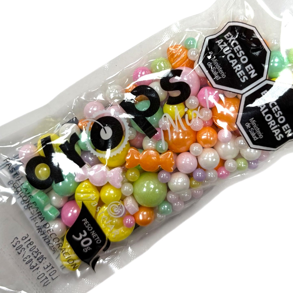 Pastillaje Grana Decoración Drops Mix Formitas Caramelos Helado Perlas Colores Surtidos 30g Ingredientes: Dextrosa, Almidón de Maiz, Azúcar, Dextrina.
