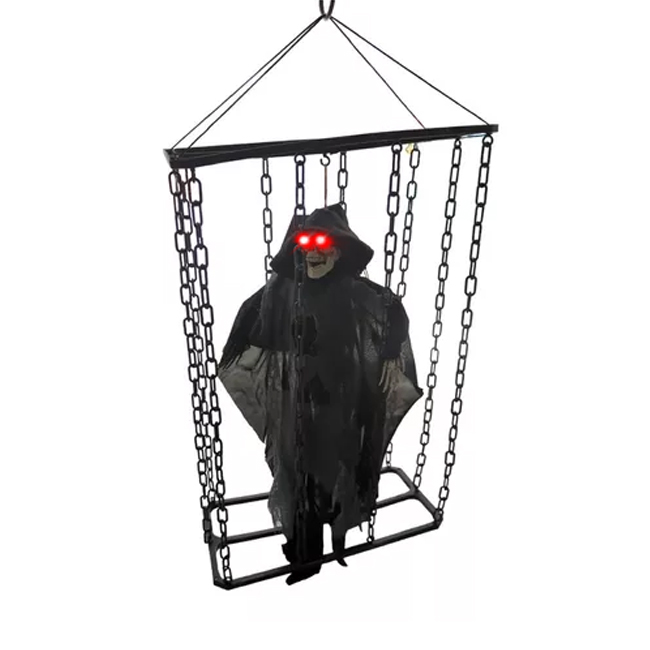 Fantasma Animatronic Esqueleto de Halloween Enjaulado Encarcelado para Colgar, con Luz Led en sus ojos, Sonido y Vibracion