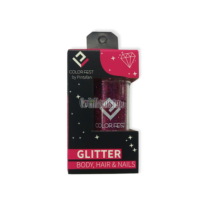 Glitter x15g Color Metal Magenta Pintafan Apto para cuerpo, pelo y uñas. Contenido Neto 15g No utilizar en menores de 3 años. Su uso debe estar supervisado por un mayor