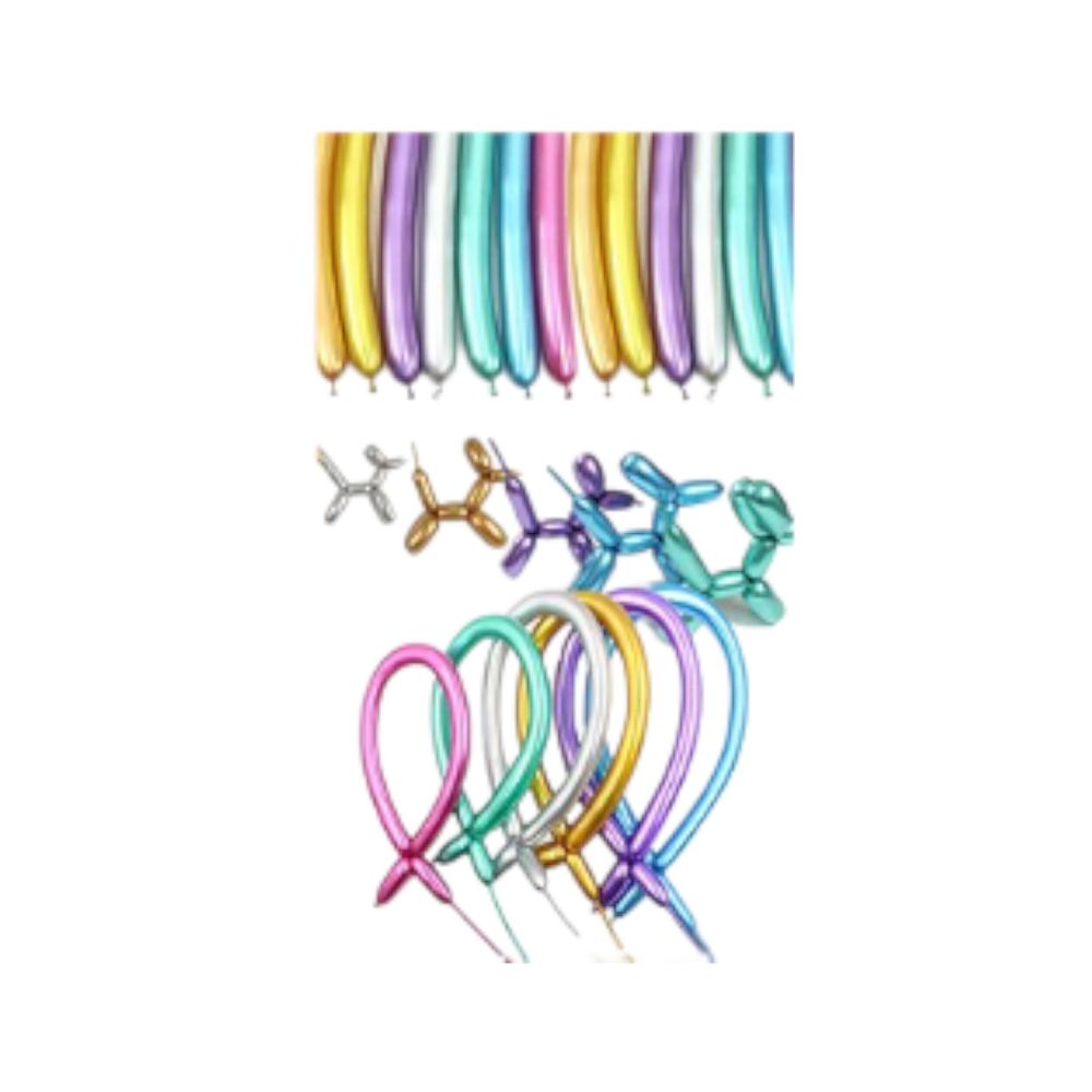GLOBO DE LATEX LARGO PARA GLOBOLOGIA CHROME MULTICOLOR X 12Unidades Ideales para Globoflexia o Torsión de Globos! Material: Látex Color: Multicolor Chrome.