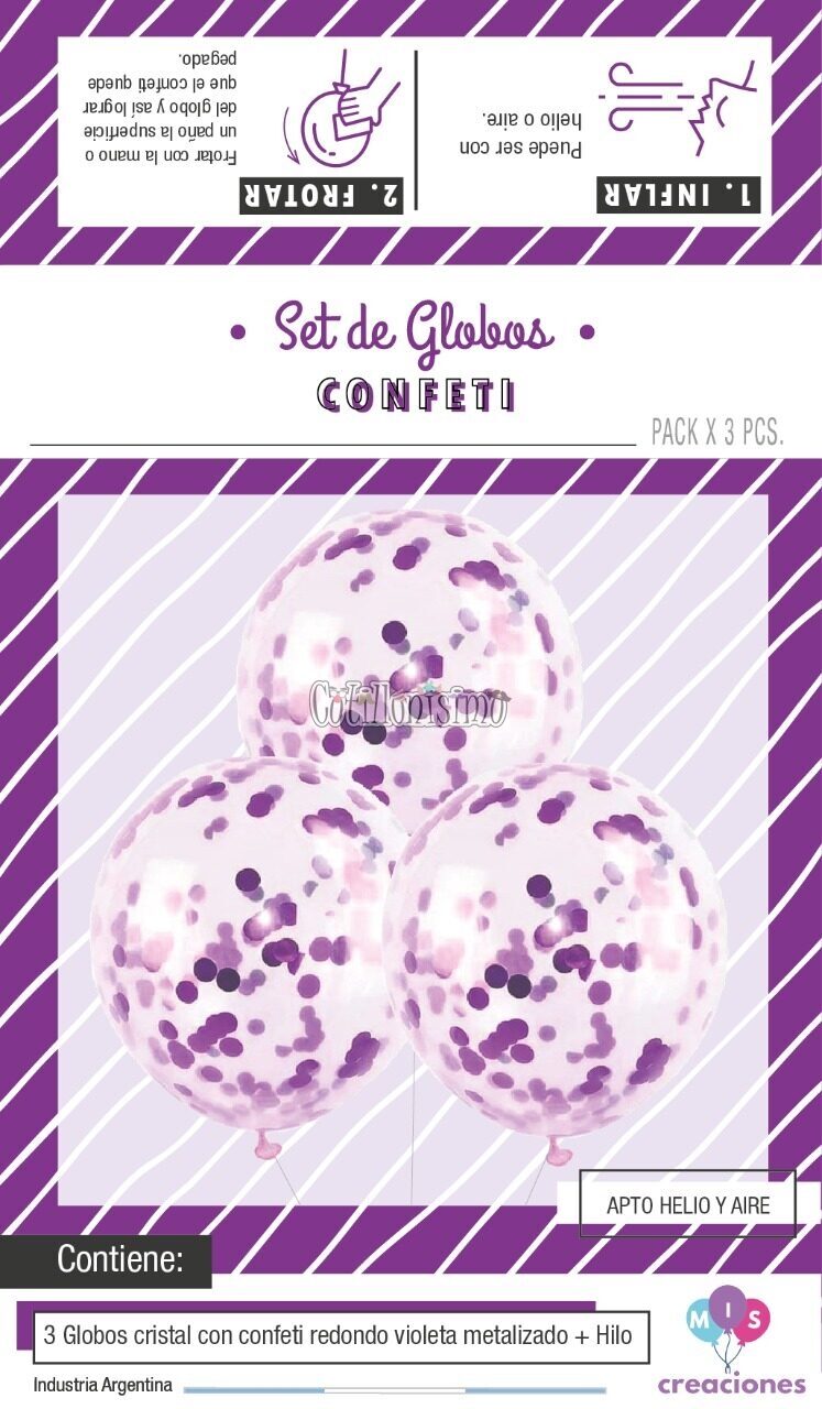 Globos con Confetti Redondo METALIZADO – VIOLETA x3 Unidades Contiene 3 Globos CRISTAL con Confetti en su interior.