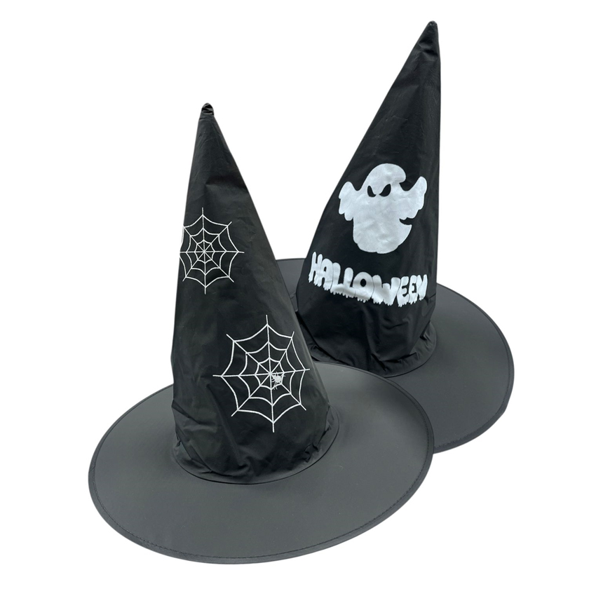 Gorro Sombrero Bruja Negro con Estampas de Halloween Fantasma Telaraña Blanco Color: Negro con Estampa blanca Material: Sintetico