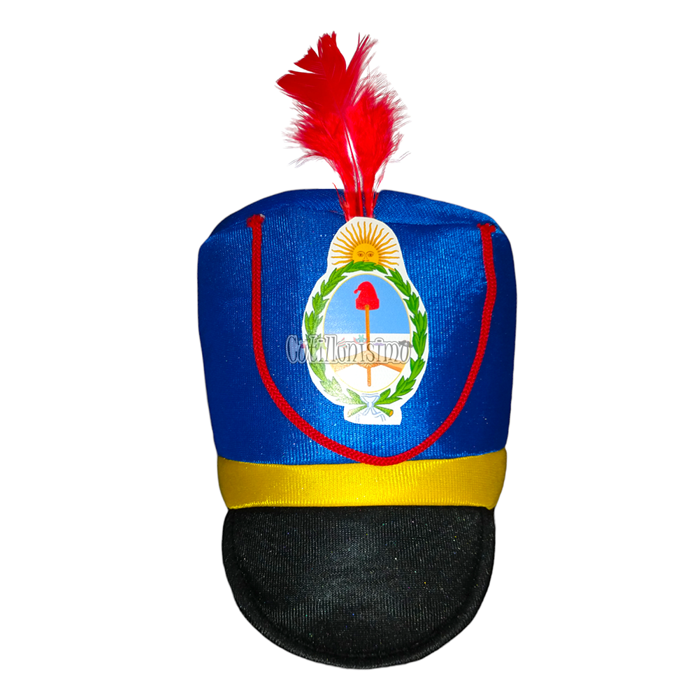 Gorro Galera «Soldado Granadero» con Pluma Jersey Patrio Color: Azul con detalles Amarillos y Pluma Roja Material: Jersey Medidas: 19cm de diámetro x 14cm de alto aproximadamente