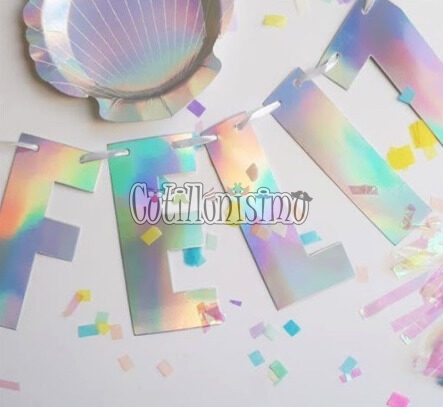Guirnalda FELIZ CUMPLEAÑOS Iridiscente Medidas aproximadas por letra: 18×12 Incluye hilo