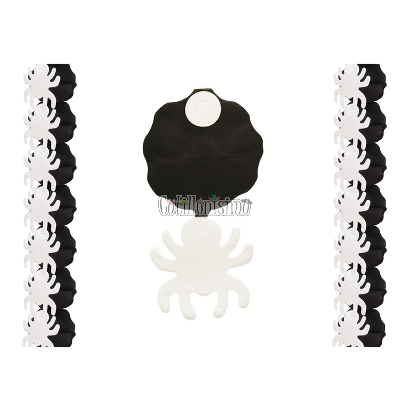 Guirnalda Vertical Araña – Negro y Blanco x2 Metros Tamaño: 2 metros total – 25 cm c/u Material: Papel Modelo: Araña en Tela de Araña
