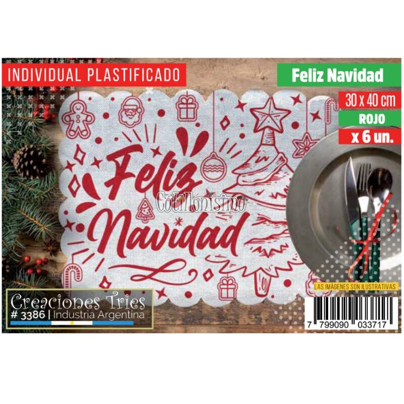 / Individual FELIZ NAVIDAD Rojo Plastificado x6u (FRISELINA)