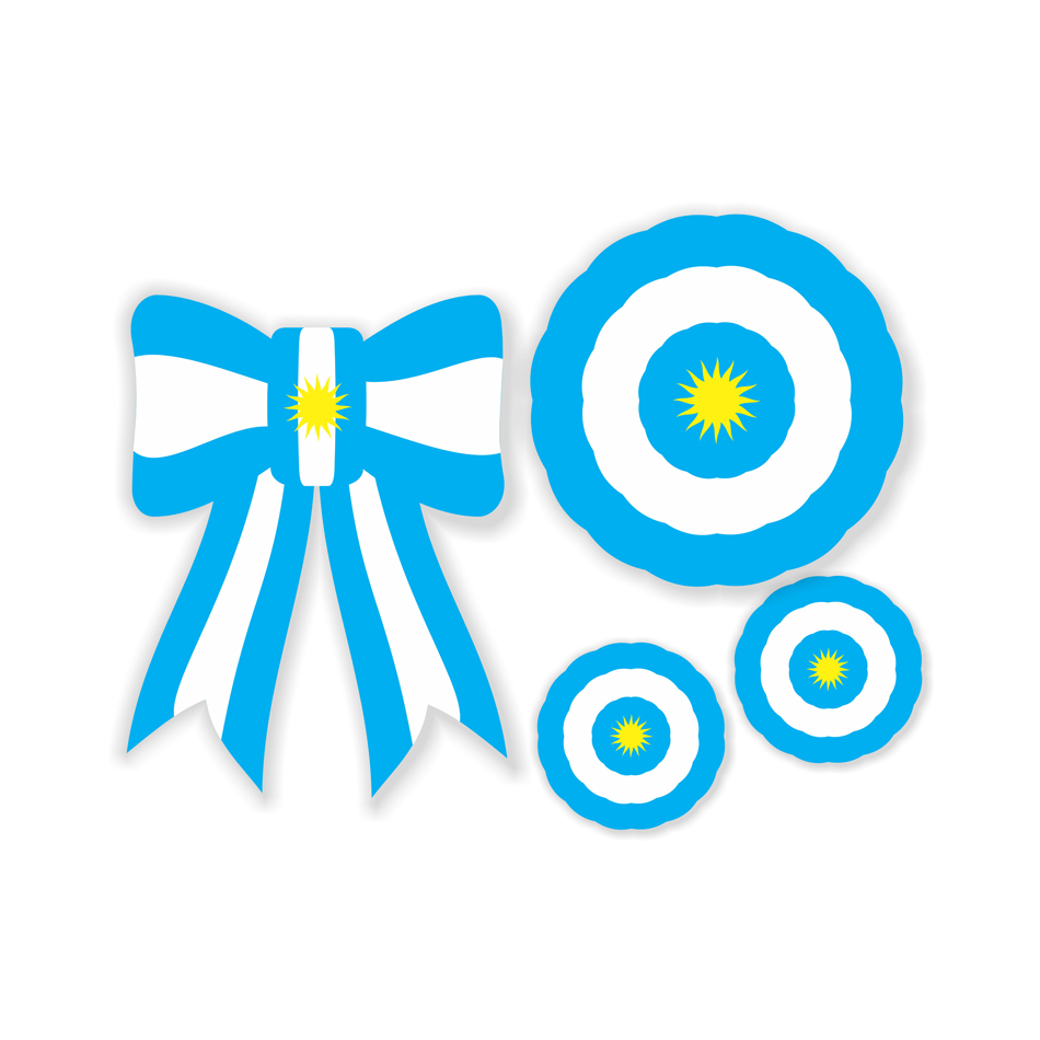 Kit Para pegar (no incluye adhesivo) Escarapelas Patrias de Cartón x4u MEDIDAS: 13cm chicas – 26cm grande – 33 x 26cm aprox moño