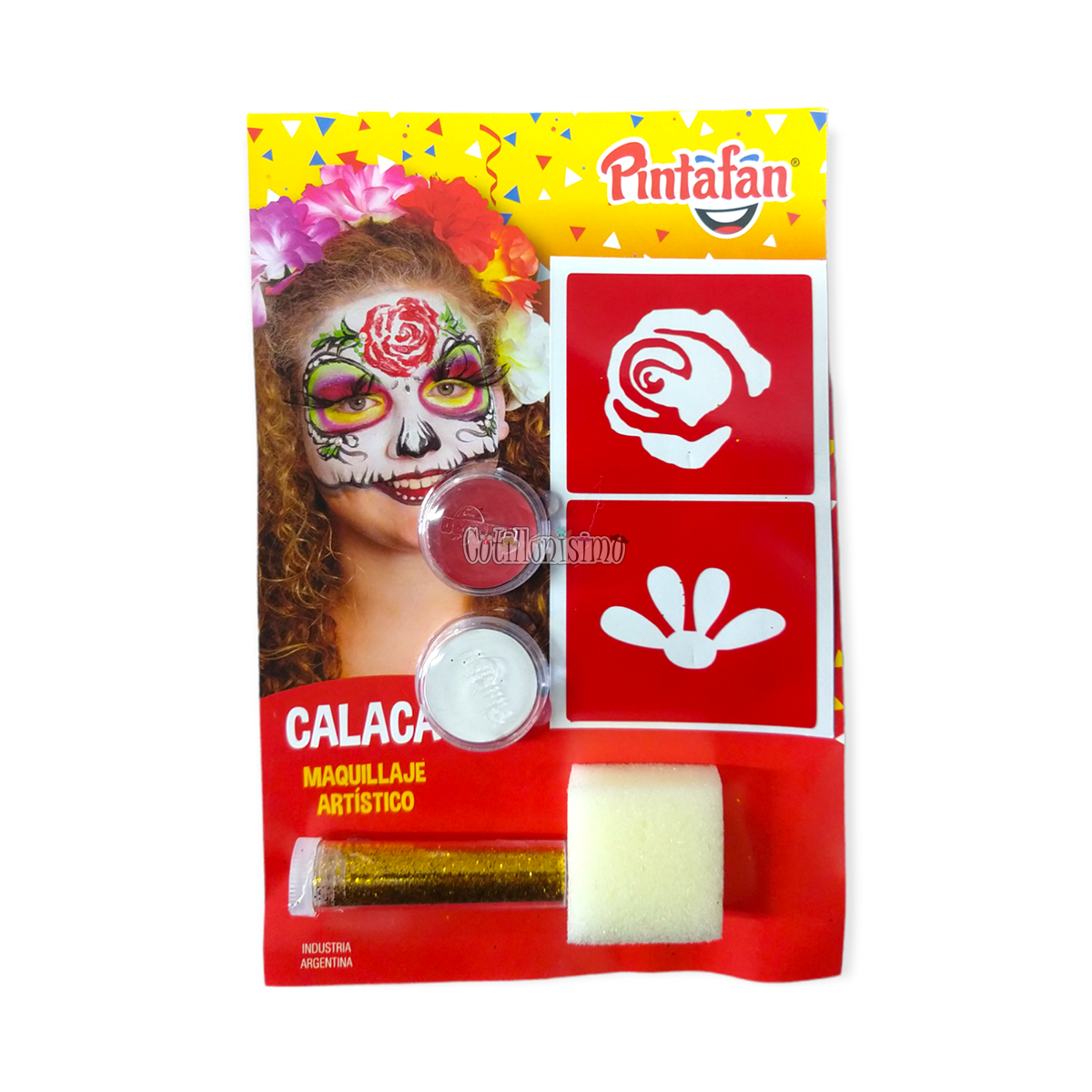 Kit Maquillaje Acua Calaca Pintafan Contiene: 2 acuarelables, 1 Glitter, stencil y esponja No toxico Utilizar bajo vigilancia de un adulto En caso de irritación suspender su uso y consulte al medico No indicado para niños menores de 3 años, contiene piezas pequeñas que pueden ser ingeridas Hipoalergénico Lavable Producto de tocador