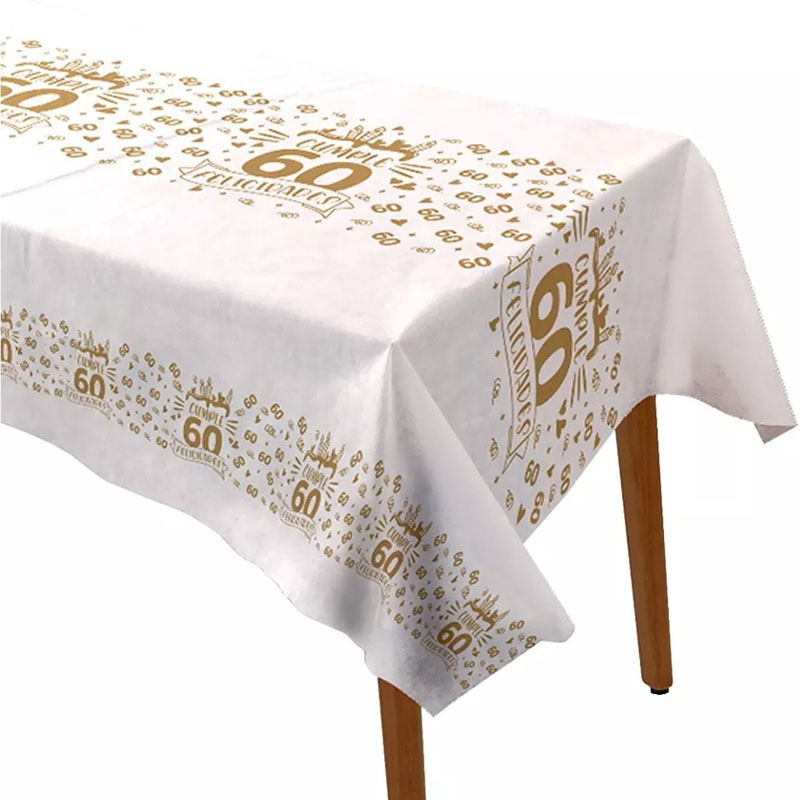 Mantel Tematico Rectangular «FELICES 60» (Friselina) Colores: Blanco y Dorado con Camino y Guarda impresas Medidas: 1,80 x 1,20mts