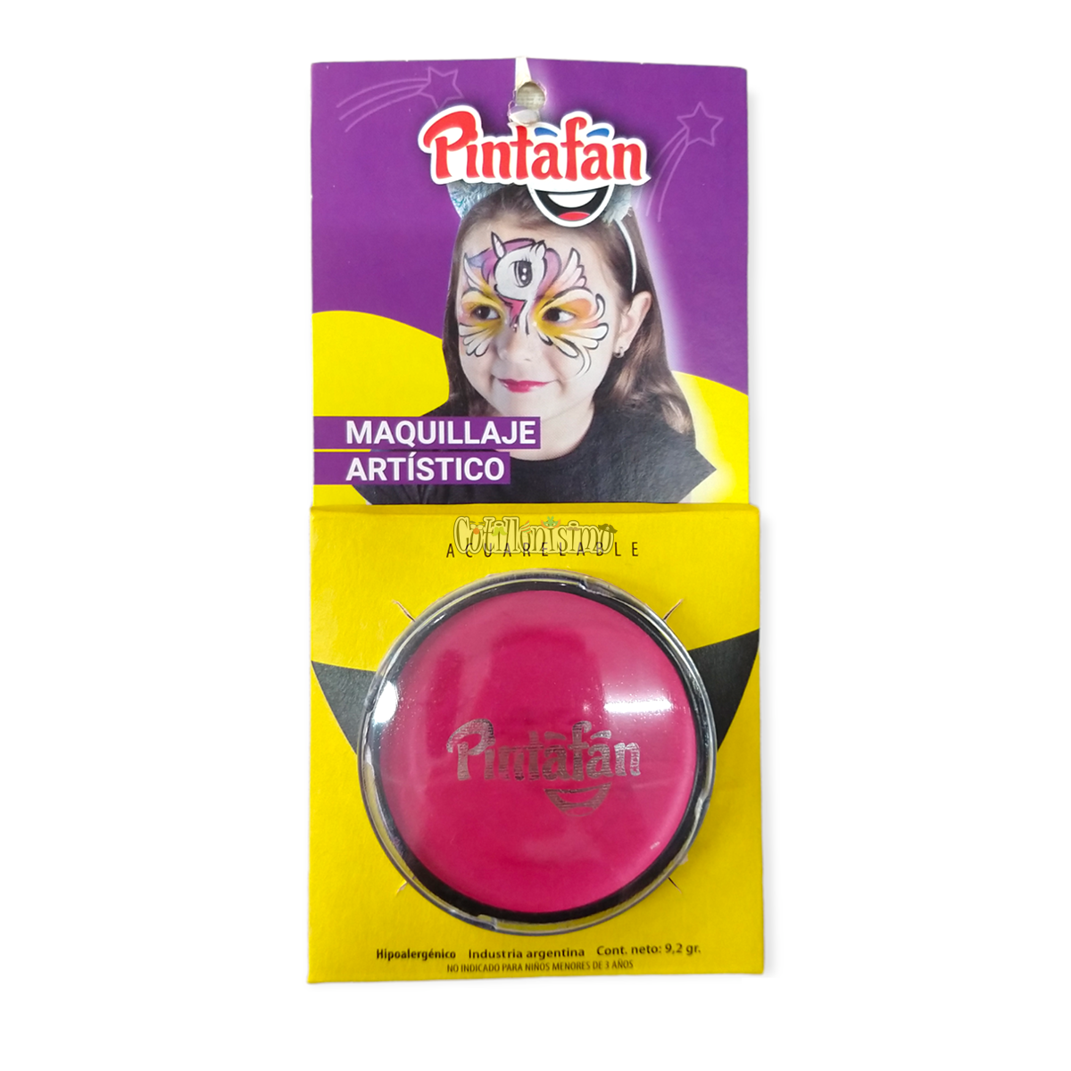 Maquillaje Artístico Acuarelable Pintafan Color Fucsia 9,2gr Maquillaje acuarelable: Aplicar mezclándolo con agua. Se retira con agua y jabón. Si se usa un pincel recomendamos que sea sintético, ya que son mas resistentes al agua. Usar esponja de látex o taponador para cubrir fondos de forma rápida y pareja. Para dar efecto de brillo usar gibré y aplicarlo sobre el maquillaje húmedo para que adhiera. Se pueden mezclar colores. Cada pastilla de 9.2gr. rinde hasta 10 caras completas, aplicando con pincel. Se puede pintar el pelo y es recomendable que esté humedecido. Utilizar bajo vigilancia de un adulto. Hipoalergénico. Contenido Neto: 9.2gr. No indicado para niños menores de 3 años.