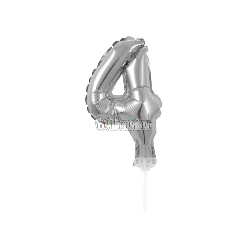 Mini Globo Metalizado Numero «4» 15 cm aproximadamente Material: Foil Metalizado. Numero: “4” Color: Plateado Medida: 15 cm aprox. Los Globos se entregan desinflados.