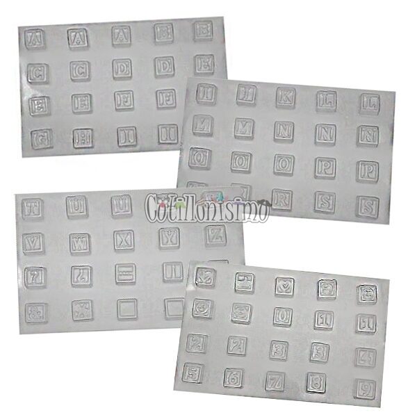 Moldes Placas de Acetato 16 x 26cm para Choco mensajes – Pascua – Bombones con formas de letras x4 piezas Contiene letras de la A a la Z, números del 0 al 9 y distintos símbolos y emojis