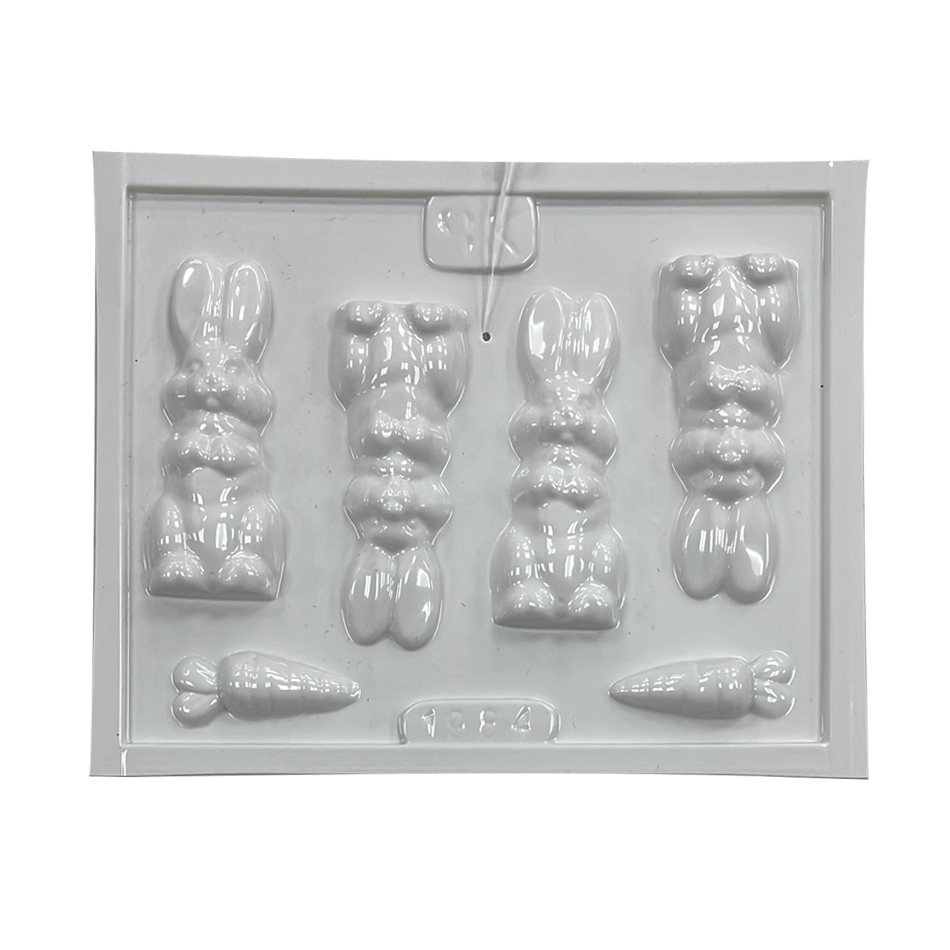 Molde Placa de Acetato 4 (cuatro) Conejos Parados y 2 (dos) Zanahorias Medidas aproximadas: Total 17 cm x 13 cm – Conejo 7,5 cm x 3 cm – Zanahoria 4 cm x 1,5 cm 1984