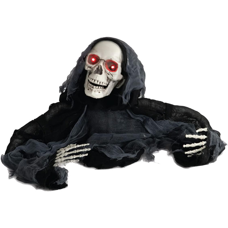 Esqueleto Muerto Saliendo del Piso de Halloween con Vendas Negras, con Luz Led Roja en sus ojos, Sonido y Vibración / Movimiento