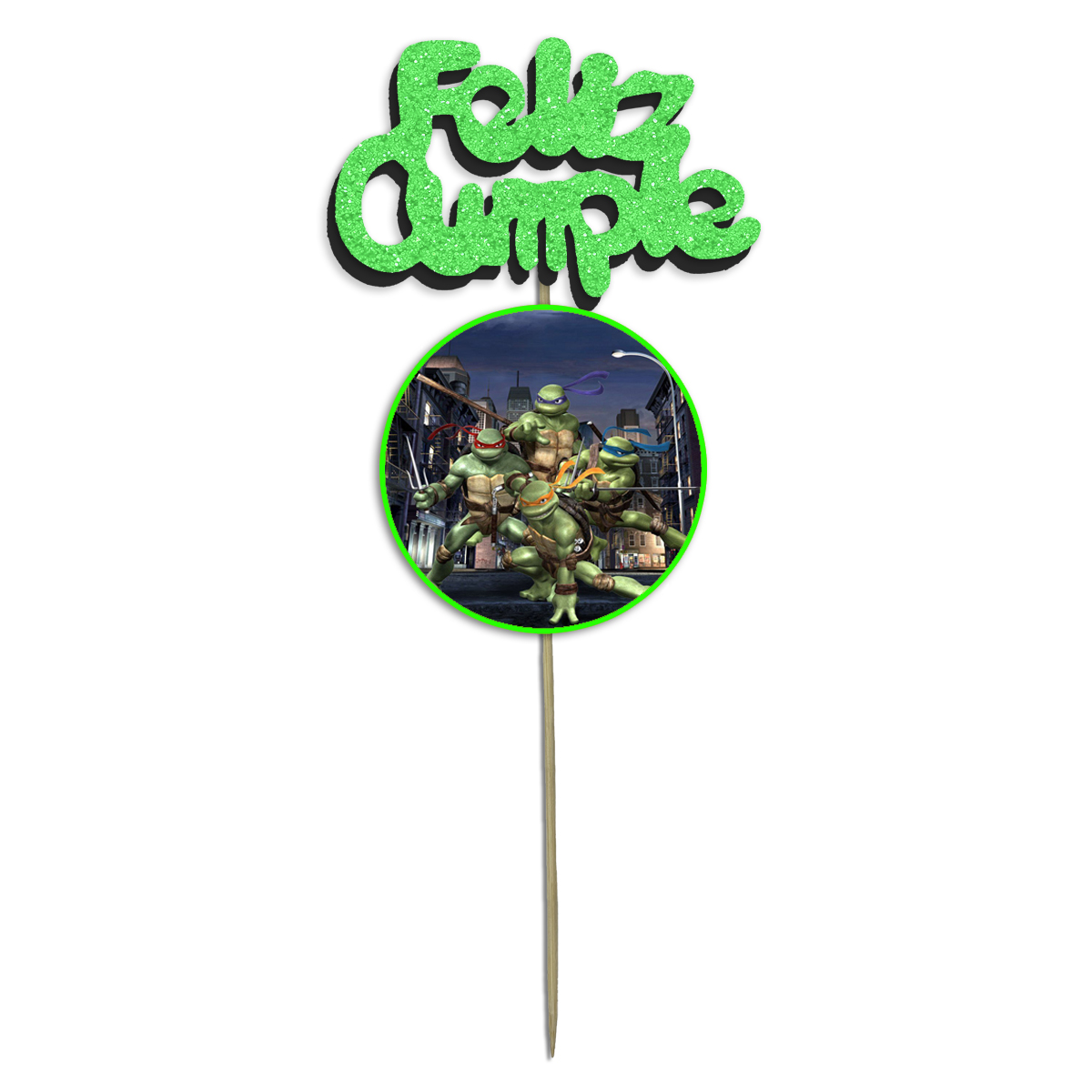 Pinche Feliz Cumpleaños Gibreado Tortugas Ninjas Turtles Medidas aproximadas: 29cm total – 9cm x 9cm Personaje – 11cm x 8cm