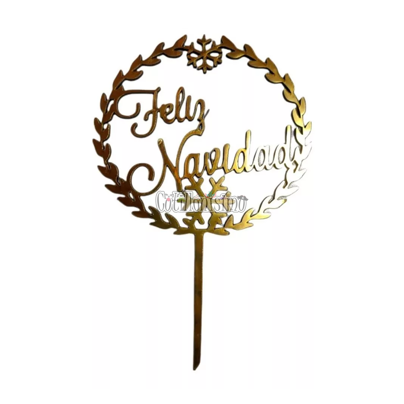 Pinche – Topper FIbro Fácil Feliz Navidad Laureles y Copo de Nieve – Redondo Dorado x1 Unidad
