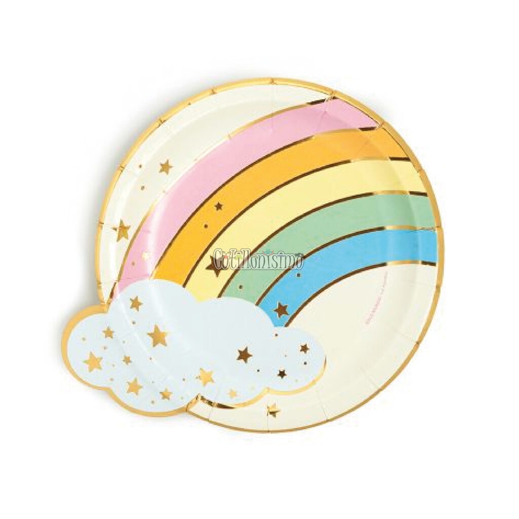Plato Carton Circular Arcoiris X8 Unidades Tamaño: 18 Cm X 18 Cm Material: Carton Modelo: Amarillo Pastel con Arcoiris y Estrellas Doradas