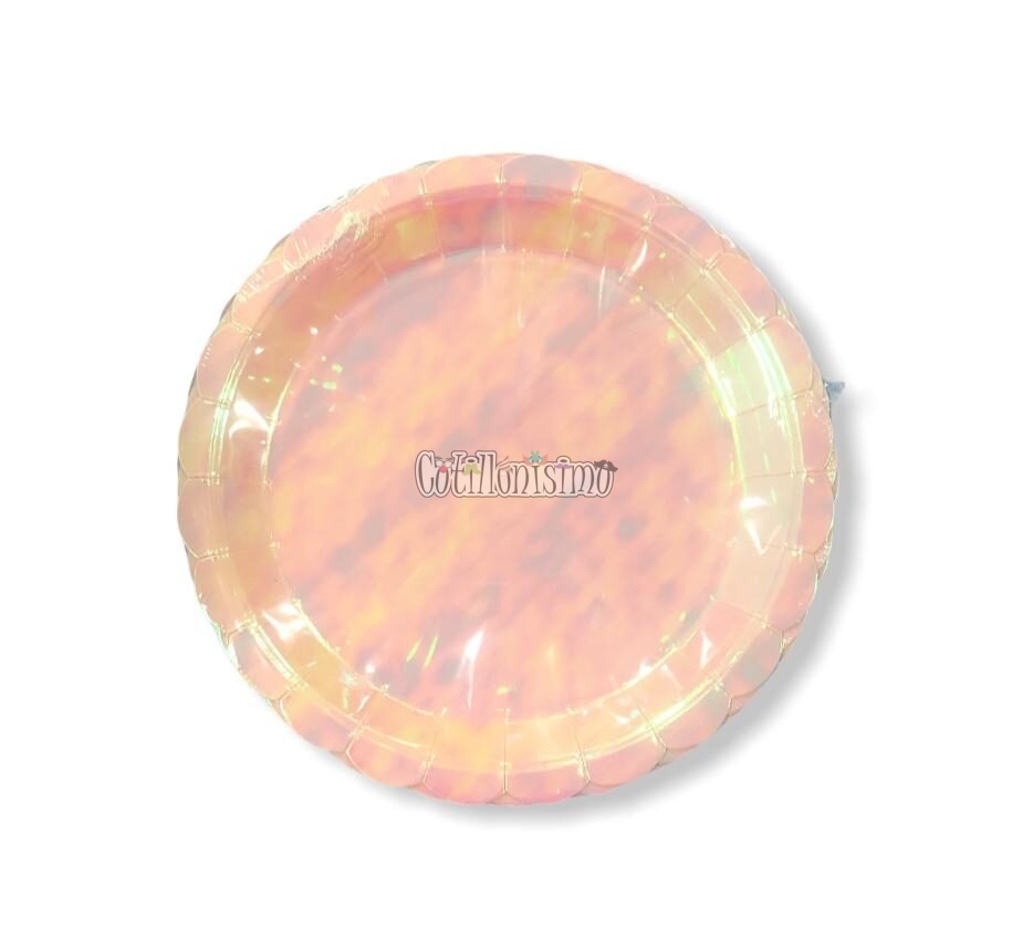Plato 18 Cm Color Salmon Iridiscente X10 Unidades Medida: 18 cm Cantidad: 10 Unidades Material: Polipapel Laminado Color: Salmon Efecto Iris