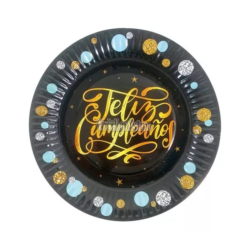 Plato Polipapel Feliz Cumpleaños Negro con Burbujas X6 Unidades
