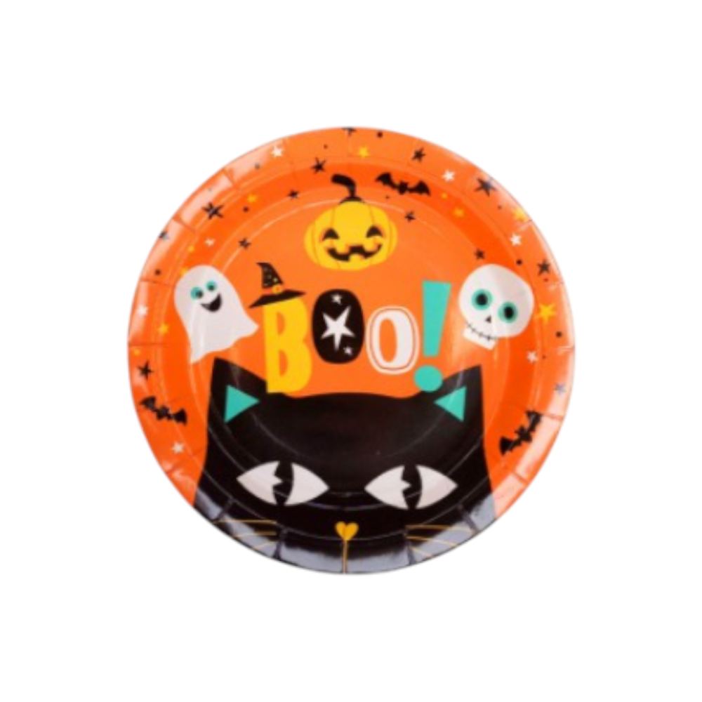 Plato Polipapel Halloween BOO x6u Color: Naranja con Detalles Gato fantasma calabaza calavera Tamaño aprox: 17cm