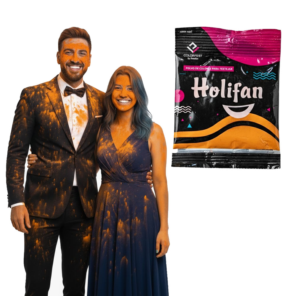 Polvo Holi Color Naranja x50grs Pintafan / Party Store La marca se entrega según su disponibilidad Biodegradable, no contamina No inflamable ni tòxico Aunque no mancha, se recomienda lavar la prenda posteriormente a su uso