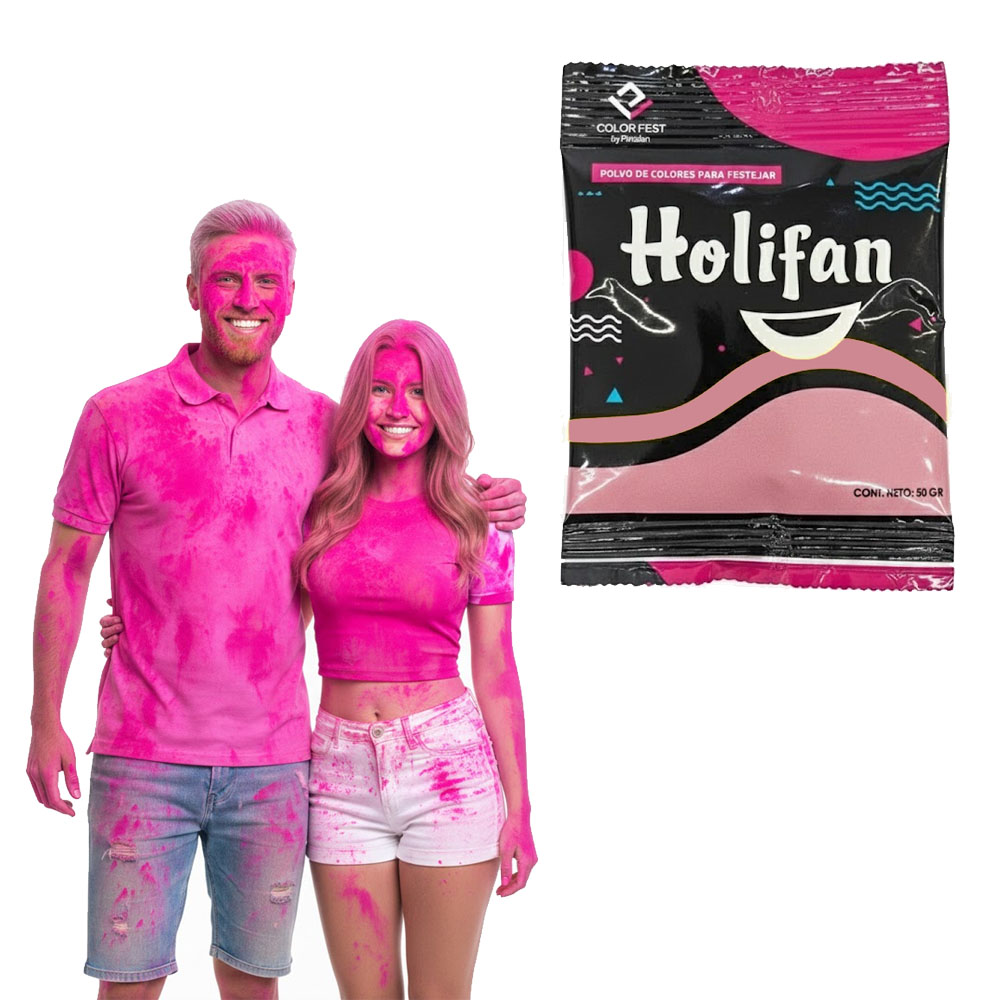 Polvo Holi Color Rosa x50grs Pintafan / Party Store La marca se entrega según su disponibilidad Biodegradable, no contamina No inflamable ni tòxico Aunque no mancha, se recomienda lavar la prenda posteriormente a su uso