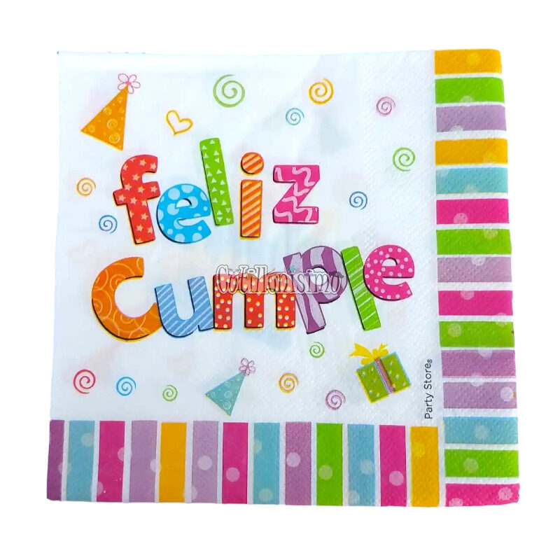Servilleta de Papel Feliz Cumple x20 Unidades Medidas aproximadas: 16,5cm x 16,5cm (doblada) 33cm x 33cm (abierta)