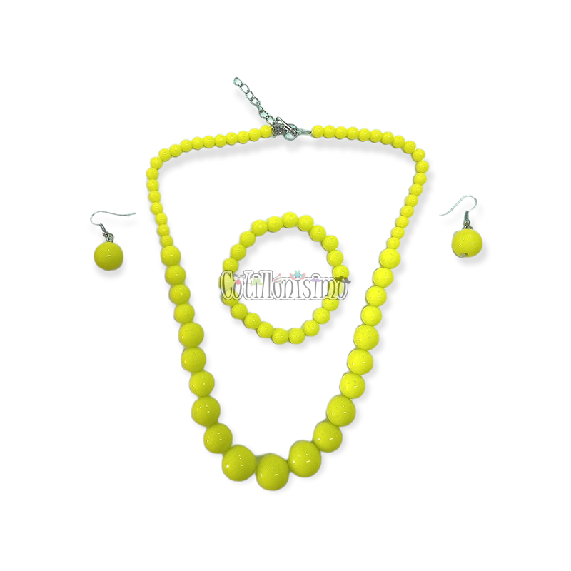 Set Collar Aros y Pulsera con Perlas Color Amarillo Fluo Incluye (medidas aproximadas):