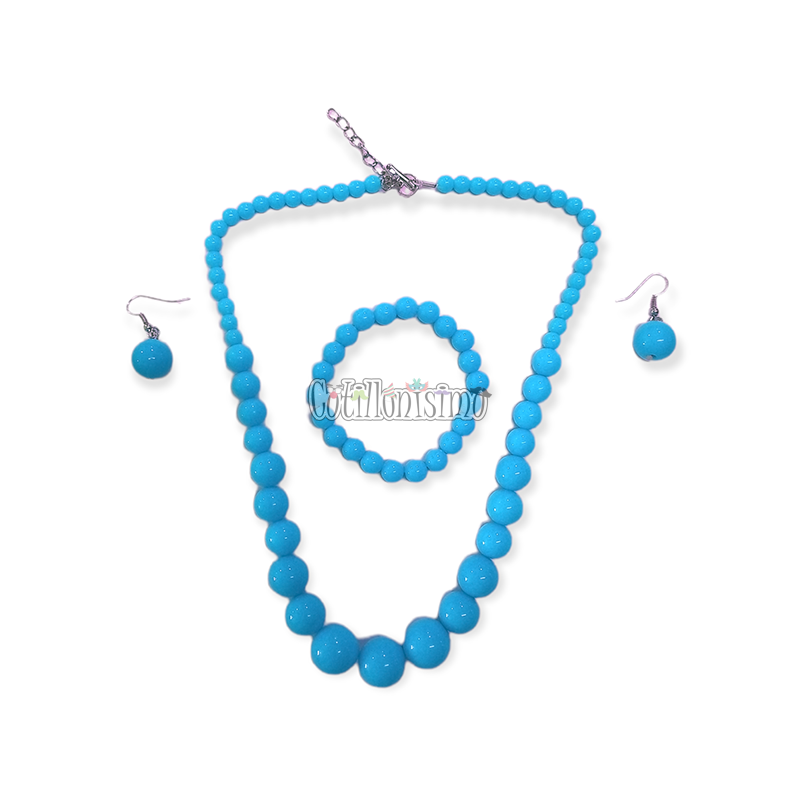 Set Collar Aros y Pulsera con Perlas Color Celeste Incluye (medidas aproximadas):