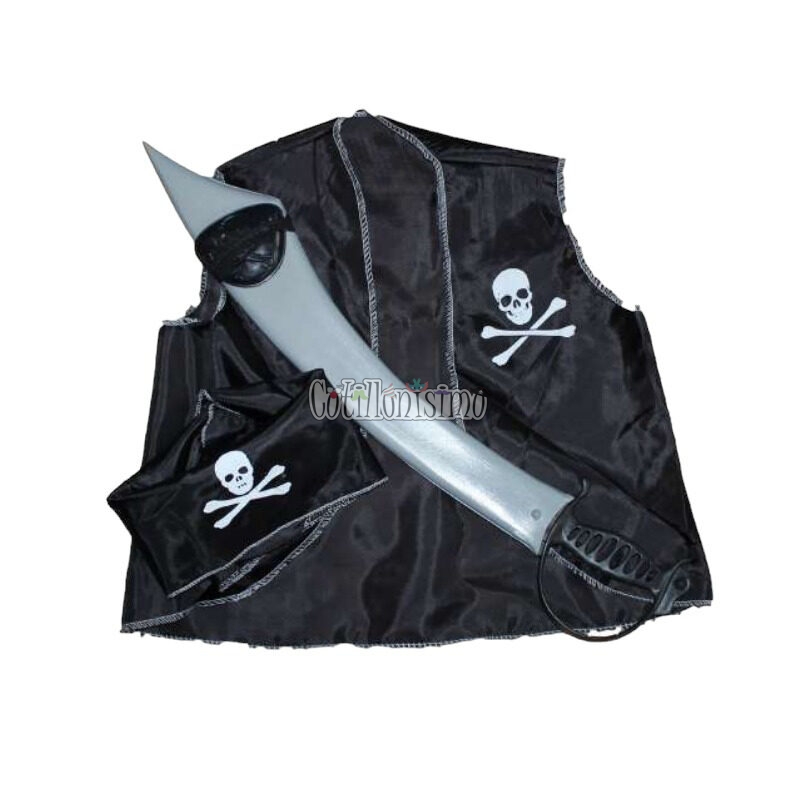 Set Piculli Disfraz de Pirata – Talle Unico Incluye: Espada, Chaleco Negro, Parche Negro, Pañuelo Negro – Calavera Blanca