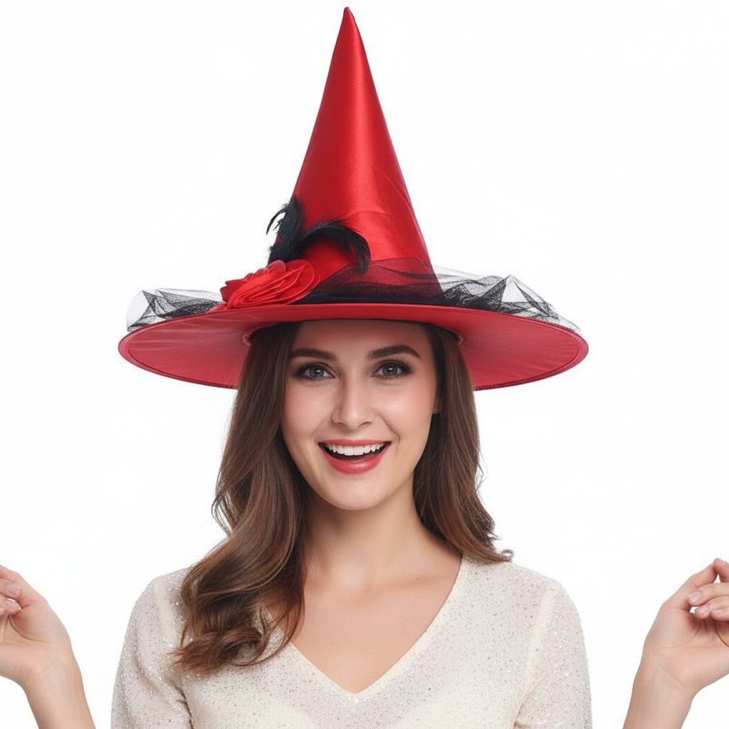 Sombrero de Bruja con Tul Rosas y Plumas Rojo